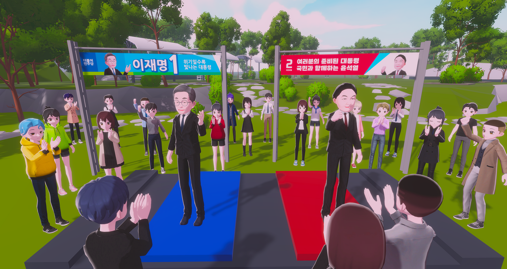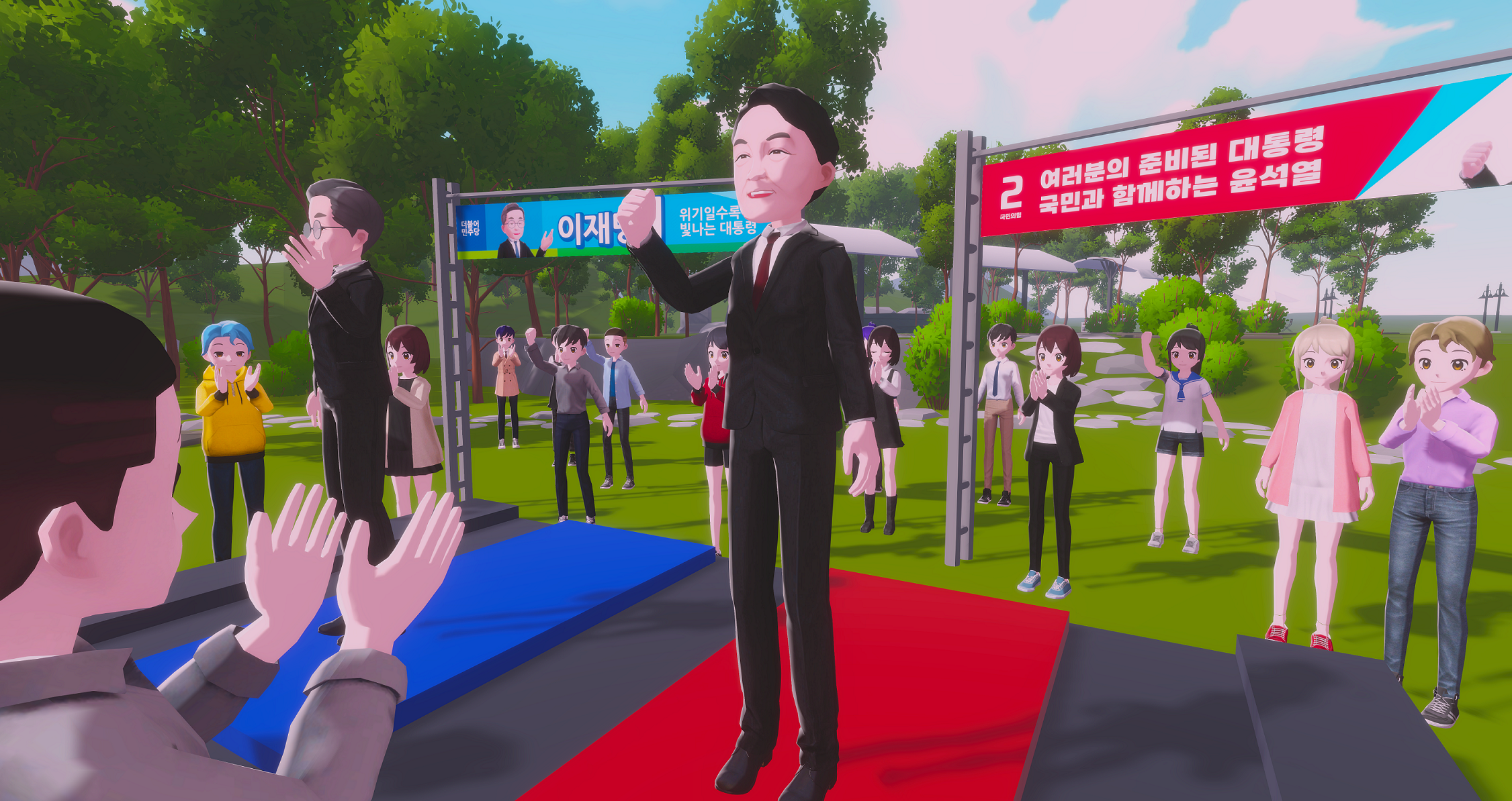 실제 후보를 닮은 3D 아바타와 NPC를 구현하여, 현실감 있는 응원·동작·표정 연출로 참여형 선거 문화를 표현한 메타버스.