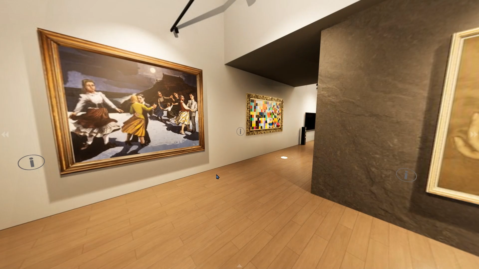 실제 미술관과 유사한 3D 공간과 조명 연출로 몰입감을 높였으며, 작품 확대 감상과 설명 기능을 통해 온라인에서도 생생한 전시 체험이 가능함.