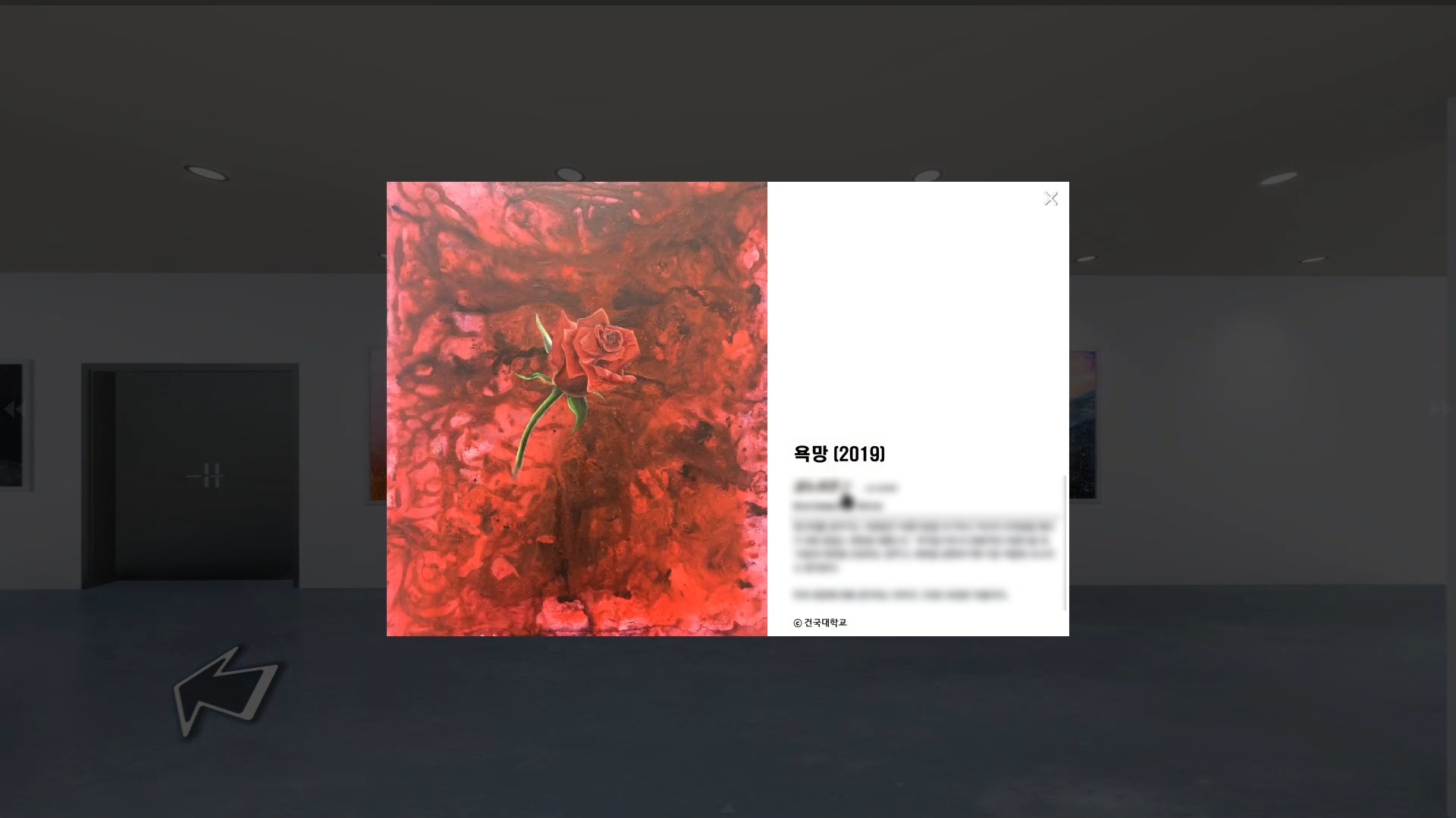 건국대학교 대학 축제와 함께 구축된 메타버스 미술관으로, 국내 유명 작가들의 105점 작품을 가상 공간에 전시.